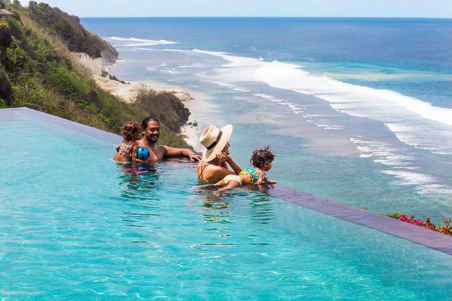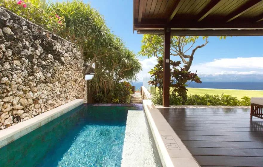 Nora Villa offers an idyllic Uluwatu escape with panoramic Indian Ocean views. Perfect for large groups, it features separate lounge and dining areas, a clifftop bale, and a private media room. An infinity pool completes this lavish getaway, designed for those seeking the ultimate luxury retreat.