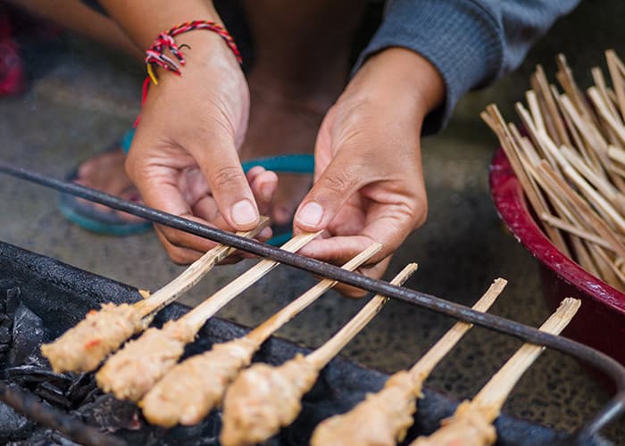 Sate Lilit is the delicious smoky barbecued meat skewer often found in the Bali street food scene. Sate Lilit consists of minced meat, often chicken, rabbit, beef, pork or fish, marinated in coconut milk and spices and wrapped around bamboo, where it is then grilled to perfection over charcoal. It differs to Sate (Satay), in that it is wrapped around bamboo sticks rather than being skewered. Sate Lilit can be enjoyed with or without the peanut dipping sauce.