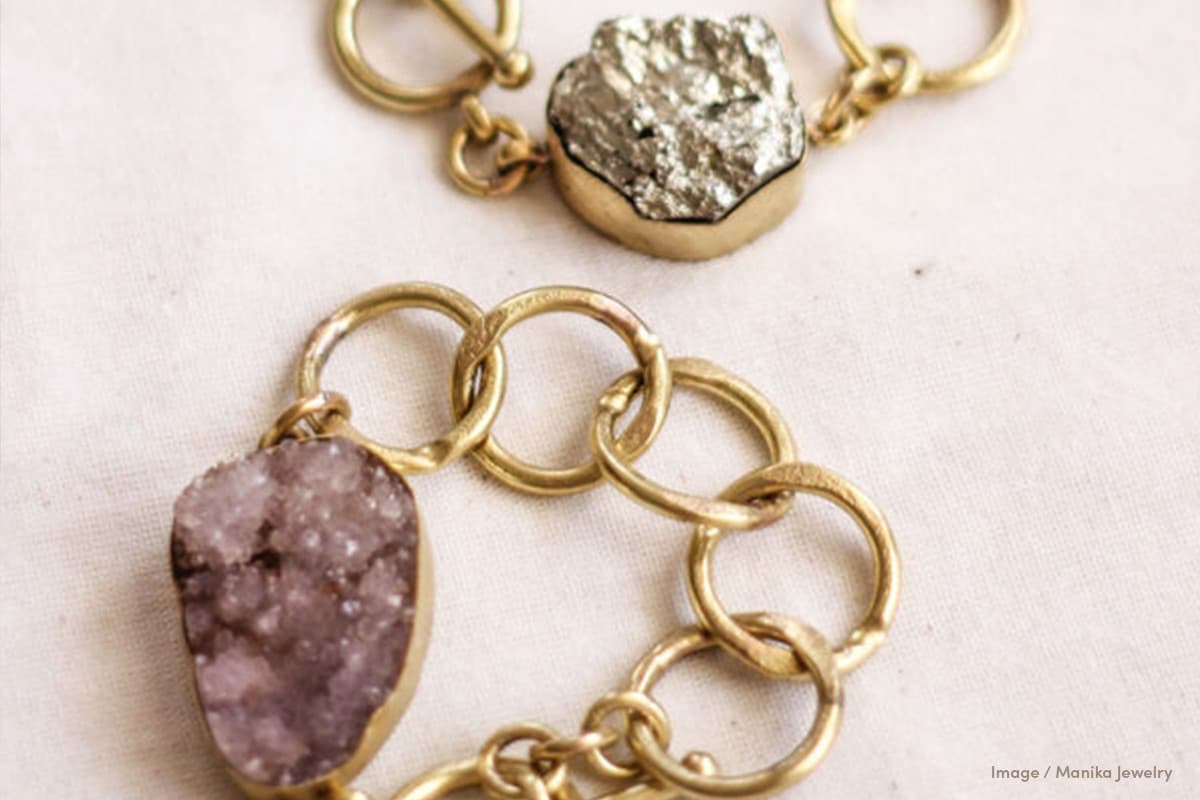 Notable pieces include the Sundari necklace, with a choice of blue topaz, green quartz or rainbow moonstone; the Ibu Luxe necklace, featuring a shiny snake chain with a moonstone gem and an 18-karat gold layer; and the Amethyst and Citrine bracelet, a classic charm and chain bracelet.