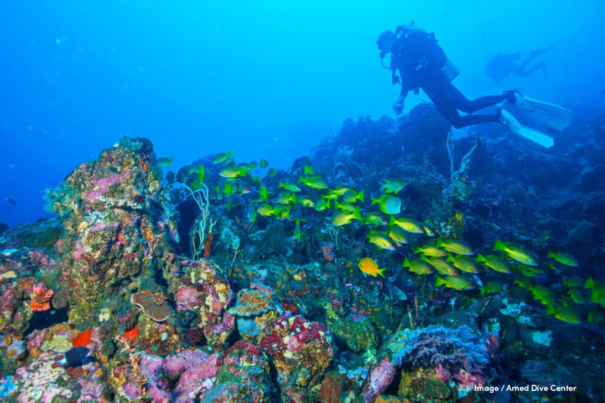Discover Amed’s Pyramids site, an artificial reef that amazes with its collection of 20 pyramid structures featuring all kinds of marine life, including snapper fish, pufferfish, ghost pipefish and nudibranchs, as well as being covered with soft corals and dreamy pink sea fans. The site also features a natural reef where you can spot blue-spotted stingrays, garden eels, harlequin sweet lips and ribbon eels. With a depth of 5-20 metres, the dive is suitable for all diving abilities, as well as an ideal spot for drift scuba diving in Bali.